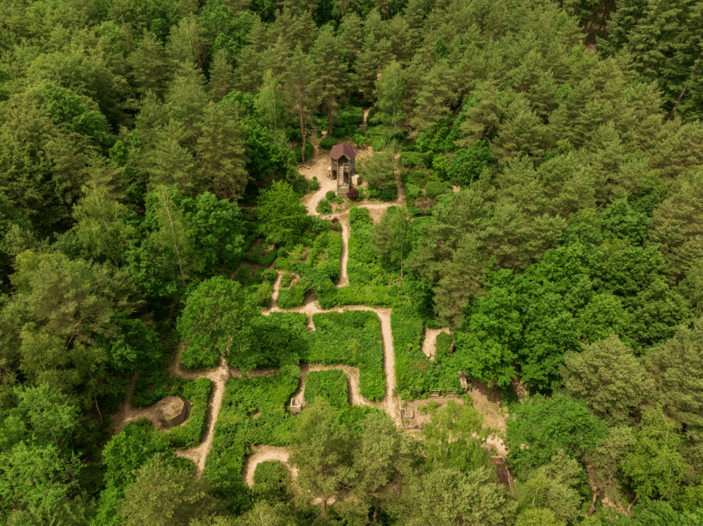 À proximité de l’Ardoise Verte, le labyrinthe végétal, qui comporte un petit village médiéval reconstitué avec un mini-château, des maisons en torchis, un petit pont de bois, a été aménagé en 2002. De nombreuses classes y sont accueillies chaque année. Unique en son genre, ce labyrinthe éducatif a été développé sur la parcelle d’un ancien verger à graines de pins Sylvestre de l’Office national des forêts. Il permet chaque année aux élèves et à leurs enseignants de s’investir sur un projet concret et créatif lié à l’éducation, à l’environnement et au développement durable, en lien avec les plantations, l’habitat de différentes époques, le domaine artistique, les cinq sens ou encore la découverte du milieu naturel.