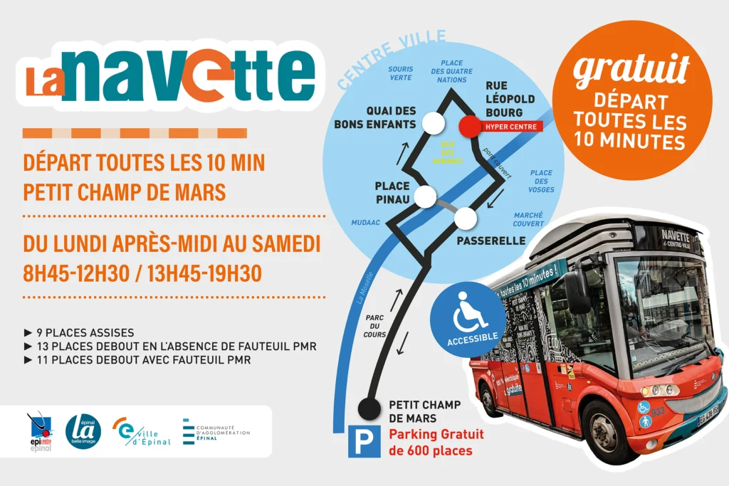 La Ville d’Épinal met à disposition une navette électrique gratuite entre le parking du Champ de Mars et le Centre-Ville. La navette fonctionne tous les jours du lundi après-midi au samedi. Fréquence toutes les 10 minutes. Elle offre 9 places assises, peut accueillir jusqu’à 13 personnes debout, ou 11 personnes lorsqu’il y a un fauteuil roulant.