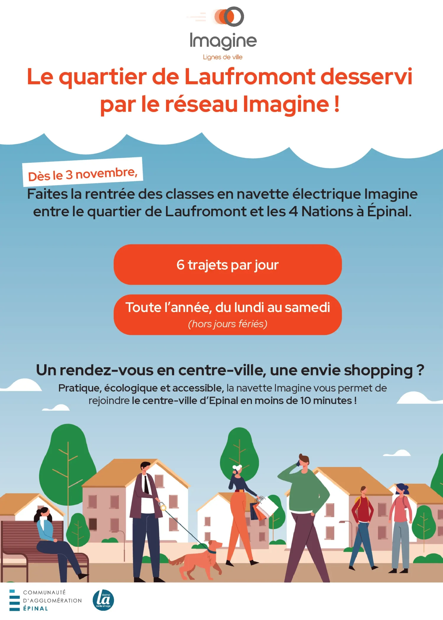 Ce service complète l’offre de vélos en libre-service Vilvolt déjà disponible. La navette Laufromont relie le quartier au centre-ville d’Épinal, avec quatre nouveaux arrêts au plus près des habitants et un terminus aux 4 Nations pour faciliter les correspondances avec l’ensemble du réseau Imagine ou poursuivre le trajet en vélo Vilvolt. Accessible, écologique et économique, cette navette électrique fonctionne du lundi au samedi avec trois allers-retours quotidiens pour tous les types de déplacements : scolaires, professionnels ou de loisirs.
